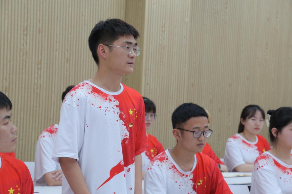 活动在庄严的国歌声中拉开帷幕。班主任吴浩老师讲述微团课《时光机里的爱国主义》,他以旧民主主义革命、新民主主义革命、社会主义建设、改革开放和中国特色社会主义新时代为时间轴,带领同学们从历史发展长河中寻找爱国主义在不同历史时期的具体内涵,坚定了同学们永远跟党走,为党的事业奋斗终生的信念。团支部副书记郭佳介绍了班级团支部建设情况。团员代表结合大别山英雄事迹踊跃发言。团支部组织委员刘倩分享了被誉为“大别山劲松”的刘名榜的故事,号召广大青年团员将个人理想与国家前途、民族命运和人民幸福联系在一起,做无愧于这个伟大时代的有为青年。青年志愿者协会会长袁乾赫讲述了女烈士晏春山的英雄事迹,表示作为志愿服务类社团的负责人,今后将弘扬“团结、友爱、奉献、进步”的志愿者精神,在奉献中提升人生高度,用青春之我,铸就青春之中国。团支部书记李保庆分享了王树声的革命故事,表示作为最年轻的一代共产党人,要牢记习近平总书记的嘱托大力发扬红色传统、传承红色基因,赓续共产党人精神血脉,把刻苦学习、报效祖国当做自己的责任和使命,把爱国热情转化为刻苦学习的实际行动。校团委新媒体中心风向标负责人武毅斌讲述了“虎将军”徐海东的故事,表示作为校园媒体人,要坚守新闻媒体第一线,服务学校大局,努力创造出有思想、有温度、有品质的新媒体作品,进一步讲好师院故事,传递师院声音。即将赴汉阳大学学习的留学生代表李航和李金阳,分别讲述了红二十五军军长吴焕先和“忠孝虎将”许世友的故事,他们表示在未来几年的留学生活中,将坚守爱国主义精神、矢志刻苦学习、奋力创新创造,时刻铭记中国公民和中国共产党人身份,做到越出国越爱国,越比较越自信,当学成归来,坚决为国家和人民贡献自己的一切!