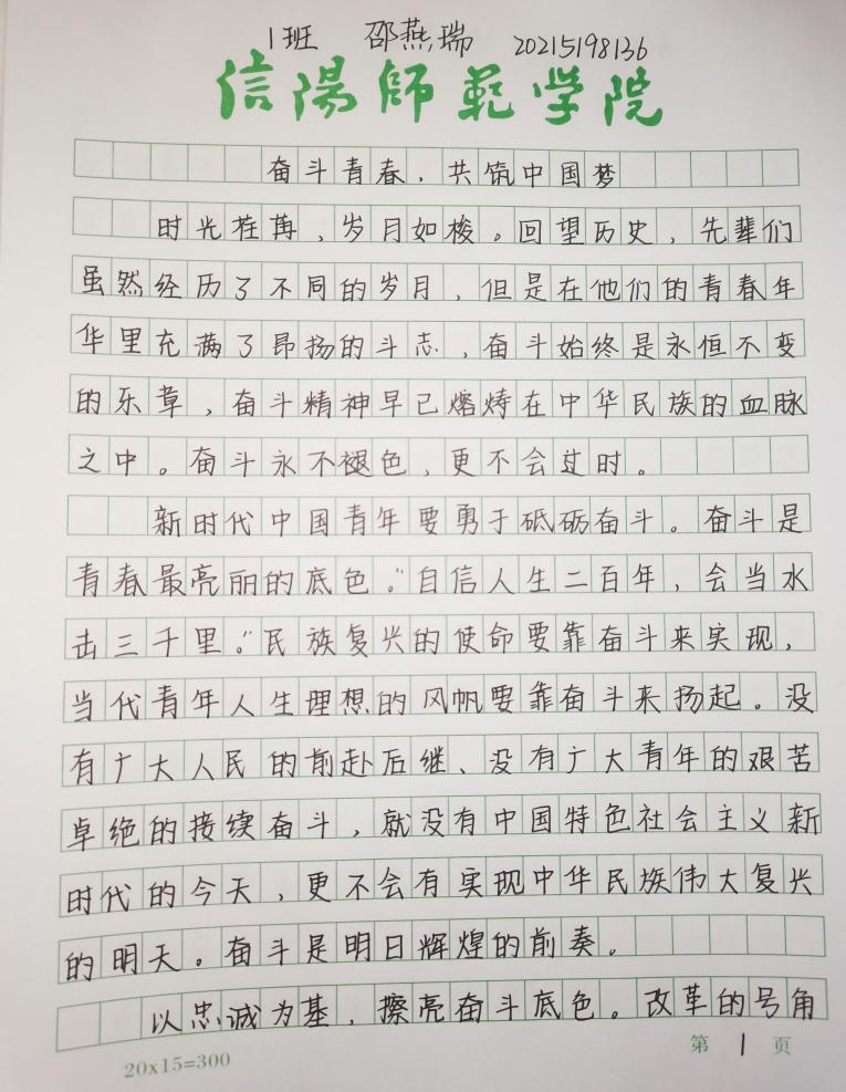 为回顾历程、总结历史、传承文化、怀念感恩、发扬精神,在全校营造浓厚氛围‘展现新中国成立以来的伟大成就,弘扬爱国主义精神和民族精神,深入推进社会主义核心价值观建设,激发学生奋发成才、报效祖国的热情。2021年11月15日,新葡京官网通过线上征稿,开展了“奋斗青春,共筑中国梦”征文大赛活动。最后经过认真筛选,挑选出部分既书写美观,又内容丰富深刻的优秀作文进行展出。