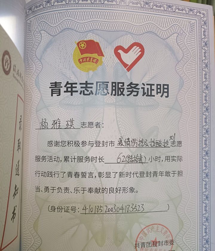 疫情来临,身为大学生应有担当,在保护自己的同时,她积极加入到家乡志作愿者队伍中,做力所能及的事,响应乡政府号召,为家乡贡献一份力量。她作为一名共青团员,积极响应团登封市委号召,报名登封疫情防控社区志愿者服务,参与线下活动,通过在家乡社区的志愿服务,她真切感受到志愿者之“奉献、友爱、互助、进步”。