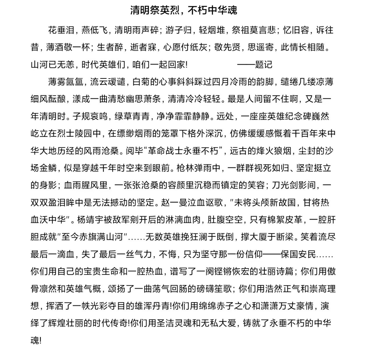云端遥寄哀思,缅怀革命先辈。“清明祭英烈,云端寄哀思”主题征文活动于4月5日在线上开展。活动充分发挥传统节日思想熏陶和文化教育的功能,进一步加强对新葡京官网学子的传统文化教育,引导其树立正确价值观。