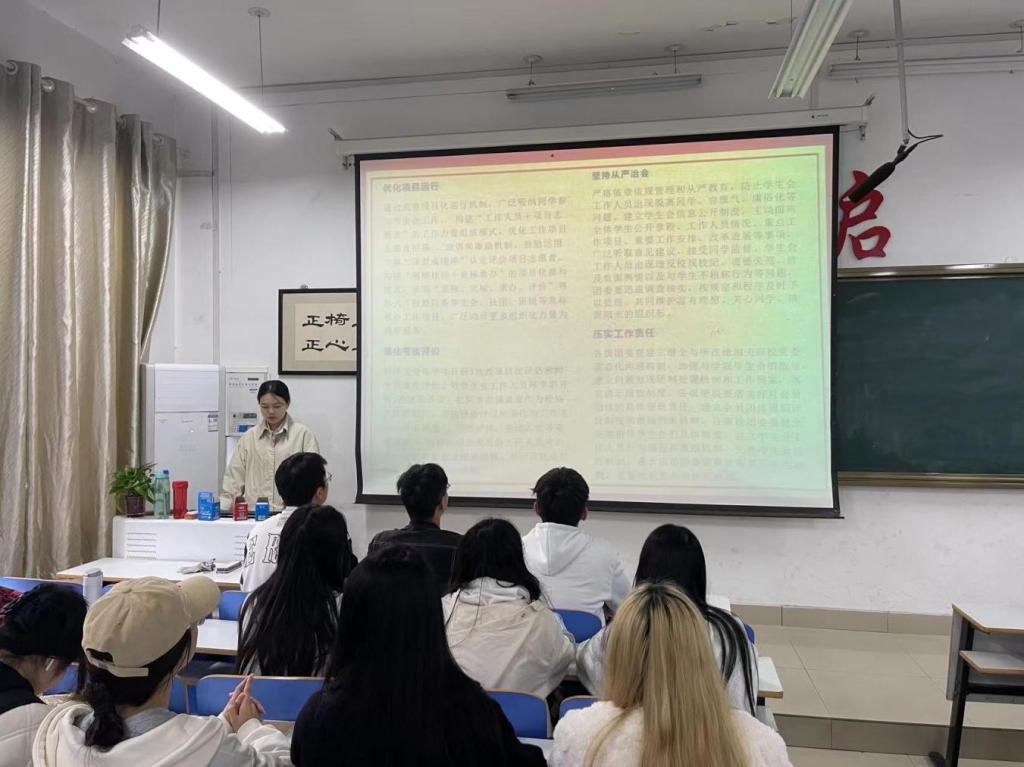 本次培训会新葡京官网学生会主席团成员杨嘉宁带领与会成员学习了《关于巩固高校学生会(研究生会)改革成果的若干措施》和《关于学联学生会工作人员改进作风服务同学的若干规定》相关内容。她从把牢政治方向、加强领导指导、当好桥梁纽带、抓实队伍建设等方面对相关内容进行了深入解读。强调学生会成员应该恪守学生本分、牢记服务宗旨、永葆情怀理想、勤勉务实做事。