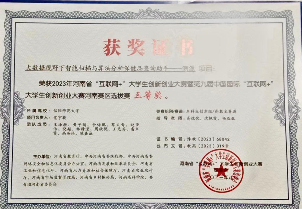王泽滟及其团队成员喜获2023年河南省“互联网+”大学生创新创业大赛暨第九届中国国际“互联网+”大学生创新创业大赛河南赛区选拔赛三等奖