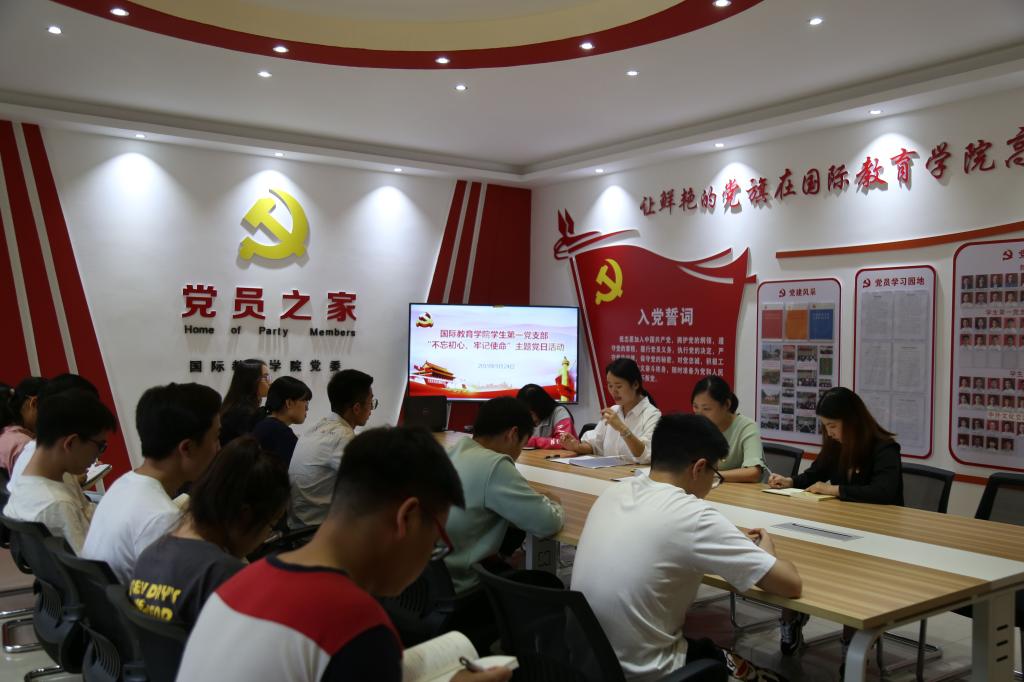 9月24日下午,学生第一党支部在逸夫楼202党员之家开展主题党日活动。会上,组织委员张雨雪传达了《中共信阳师范学院委员会关于开展“不忘初心、牢记使命”主题教育的实施方案》精神;全体党员观看了《初心永恒》专题纪录片;党员交流发言;支部书记余艳楷对本次“不忘初心、牢记使命”主题教育支部以及党员层面需要开展的工作进行了强调,希望每名党员能够认真落实“守初心、担使命,找差距、抓落实”总要求,制定一个学习计划,列出一个问题清单,开展一次志愿服务,实现一次思想政治洗礼;全体党员重温了入党誓词。