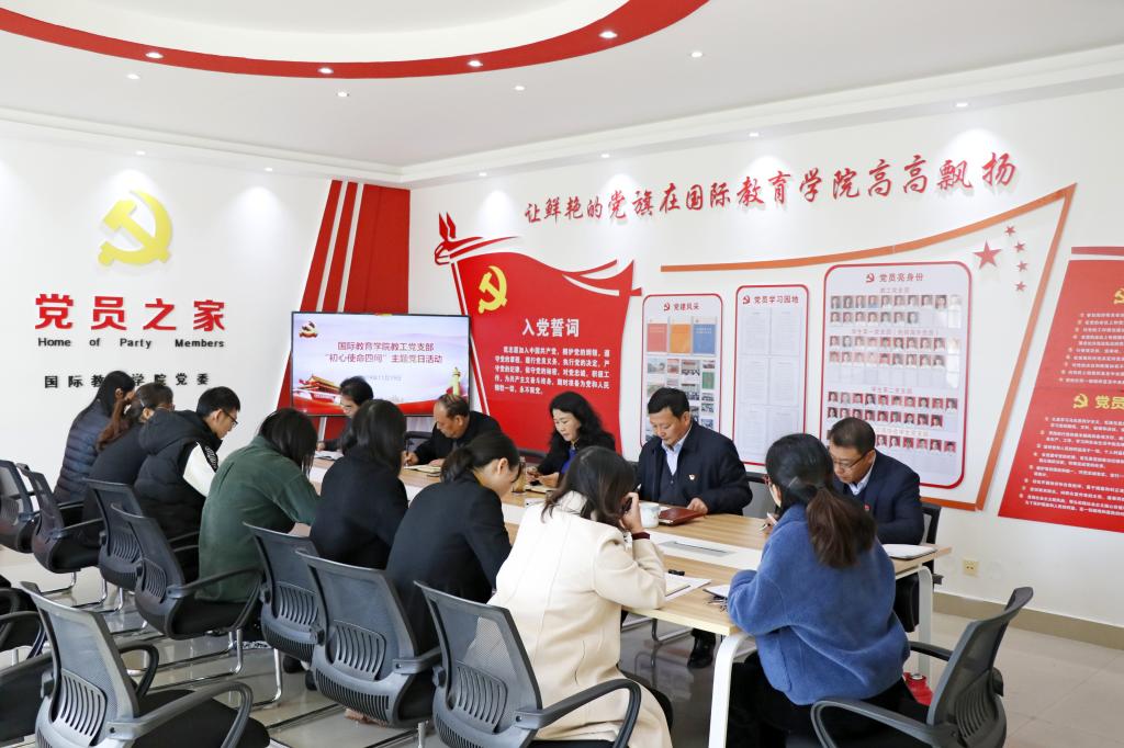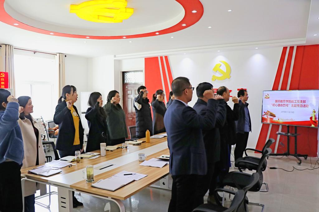 党委副书记姚新春传达了中共河南省委“不忘初心、牢记使命”主题教育领导小组办公室《关于在第二批“不忘初心、牢记使命”主题教育中开展党员“初心使命四问”主题党日活动的通知》(豫教办发[2019]24号)文件精神;郭寻带领全体党员重温入党誓词;全体党员围绕“入党初心是什么、党员使命担什么、对照先进差什么、立足本职做什么”进行发言,开展了“初心四问”交流研讨。