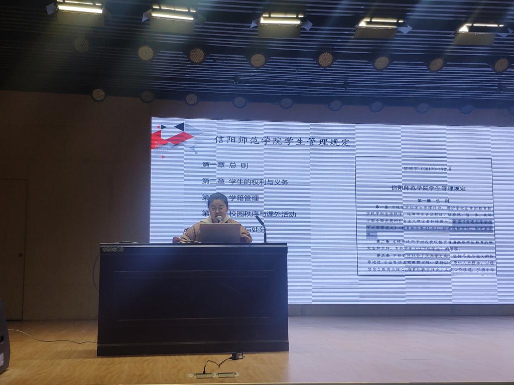 许孟杨老师围绕新生报到学籍管理、学籍注册、入学资格复查、综合测评分数计算、学生第二学位辅修、第二课堂学分管理、学生纪律处分、毕业与结业条件等内容,具体讲解了《信阳师范学院学生管理规定》的各项内容,教育引导学生遵守学校管理制度,承担应尽的义务与责任,养成良好的道德品质和行为习惯,在许孟杨老师生动形象地讲解中,新生们很好掌握了学校及学院的各项管理条例。