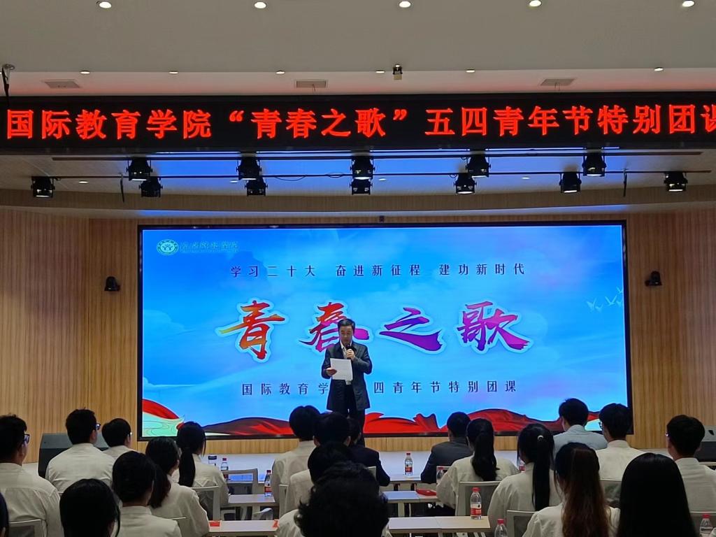 在第74个五四青年节到来之际,为深入学习贯彻党的二十大精神,落实立德树人根本任务,引导广大青年自觉践行习近平总书记对广大青年的殷殷嘱托,树正价值观念,立志听党话、跟党走,使党的政策主张切实转化为投身民族复兴伟业的自觉行动,5月4日上午,3003新葡的京集团网址党委在博雅讲堂举办“青春之歌”五四特别团课活动。校党委副书记、工会主席岳宗德、校团委副书记张鹏、商学院副院长俞彤辉、3003新葡的京集团网址领导班子成员、博士教师张雨雪、全体辅导员和优秀共青团员代表参加活动。