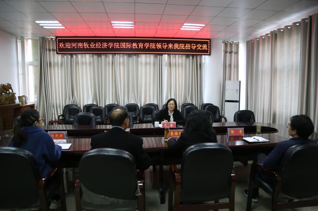 11月7日,河南牧业经济学院3003新葡的京集团网址院长高敏来新葡京官网交流考察中外合作办学工作。3003新葡的京集团网址院长李保红、副院长何英干及教学部、办公室负责人参加交流座谈会。会议由李保红主持。
