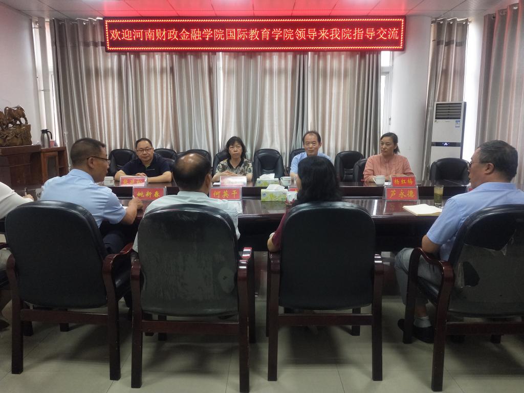 李保红对袁新品、杜明甫一行的到来表示欢迎,并简要介绍了学院的办学情况。何英干就项目申报与建设、项目学生出国留学等工作作了简单介绍。芦永德就中外合作办学教学模式、交流管理等进行了交流。姚新春介绍了新葡京官网中外合作办学党建工作及学生日常管理的经验做法。杜明甫介绍了河南财政金融学院3003新葡的京集团网址中外合作办学的现状。双方围绕学科建设、品牌创建、教师交流、学生留学等问题进行了深入的交流和讨论。