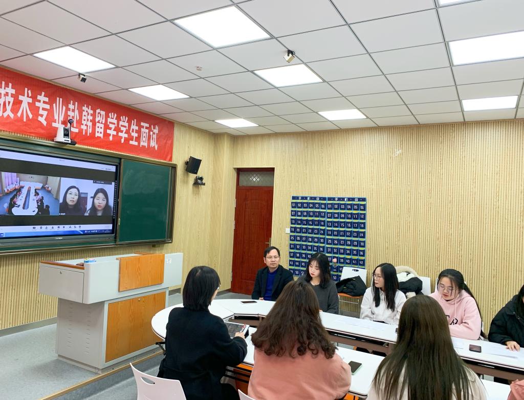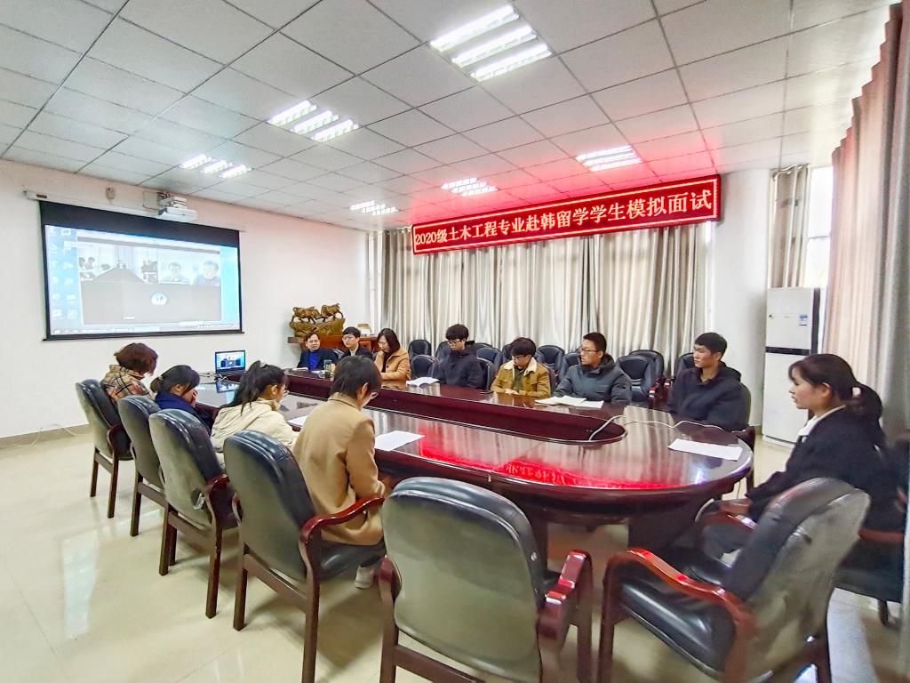 12月13日,新葡京官网在逸夫楼302室、201室对2020级土木工程专业、生物技术专业有意愿赴韩国汉阳大学留学学生开展模拟面试工作。副院长姚光金,外籍韩语教师白炅翰(백경한)、朴信爱(박신애),项目部、出国留学指导中心负责人,英语、韩语教研室专任教师参加了本次工作。本次模拟面试以双专业双会场云面试形式进行,由外籍教师与英语教研室教师使用韩英双语进行线上模拟面试,相关负责人在现场进行实时指导。